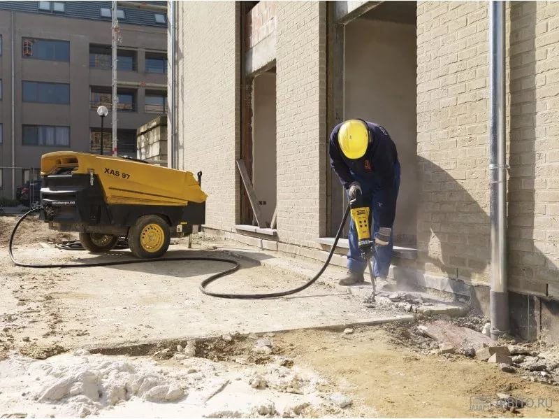 Демонтажные работы. Отбойный молоток разносит бетон, кирпич, асфальт. Это основное применение компрессора на стройке. Один оператор справляется с объёмом работы, на который раньше нужна была бригада.